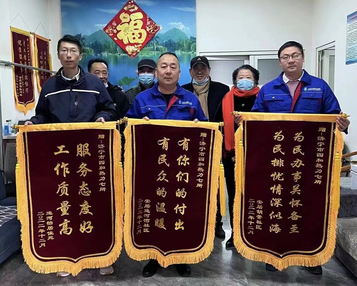 12月8日,胡營(yíng)回遷一期、胡營(yíng)回遷二期運(yùn)河灣、胡營(yíng)運(yùn)河怡居佳苑三個(gè)小區(qū)的業(yè)委會(huì)代表以及胡營(yíng)回遷一期唐營(yíng)黨支部領(lǐng)導(dǎo)專(zhuān)程前往濟(jì)寧四和供熱有限公司供熱服務(wù)七所,將四面鮮紅的錦旗送到所長(zhǎng)劉延春手中,感謝始終奮戰(zhàn)在供熱一線的工作人員的辛勤付出。